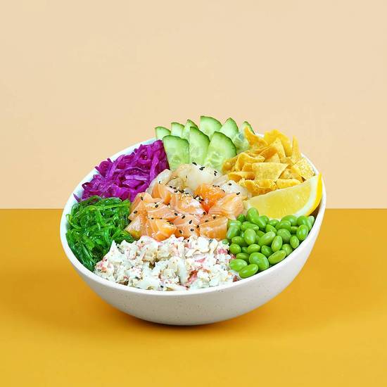 Regular. Sashimi salmon, cooked prawns, pickled cabbage, edamame, cucumber, crab salad, seaweed salad, wonton chips and hawaiian soy.