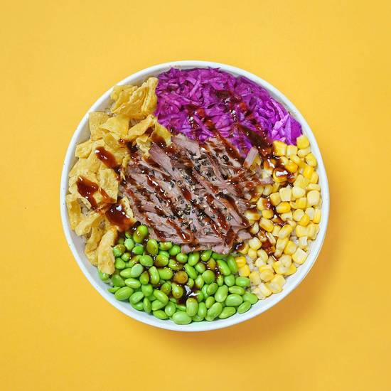 Regular. Slow cooked beef, edamame, sweet corn, wonton chips, pickled cabbage, teriyaki sauce and sesame mayonnaise.