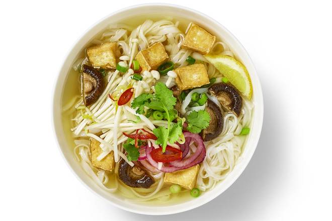 A vegetarian twist on phở featuring mushrooms, tofu, flat rice noodles, fresh herbs, and a light yet flavorful vegetable broth.