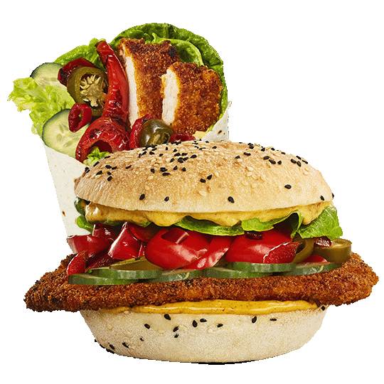 Spicy crumb schnitzel, pickled chilli & jalapenos, baby cos lettuce, cucumber, sauteed peppers & hot curry mayonnaise.