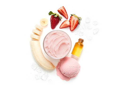 Strawberries, banana, apple juice, strawberry yoghurt & ice