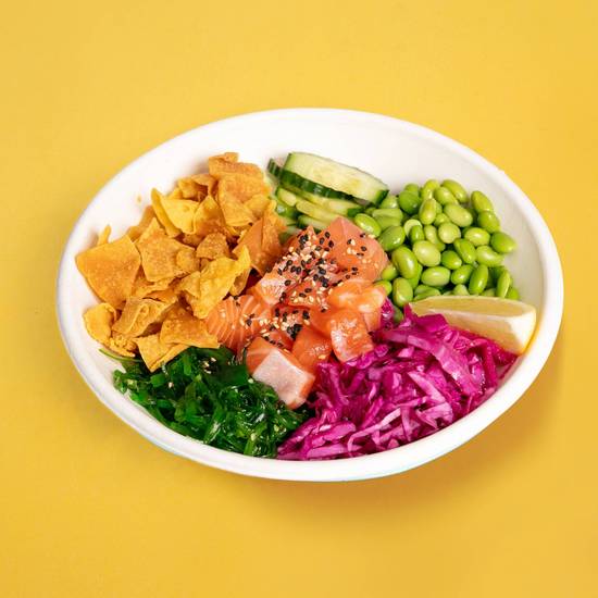 Sashimi salmon, pickled cabbage, edamame, seaweed salad, cucumber, wonton chips and hawaiian soy.