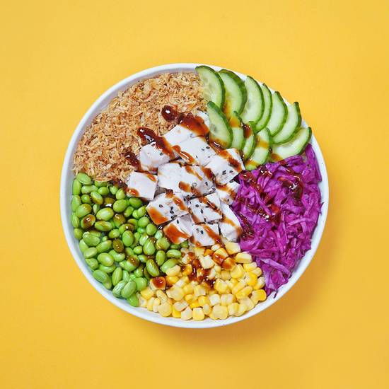 Chicken breast, pickled cabbage, edamame, sweet corn, cucumber, crispy shallots and pineapple teriyaki.