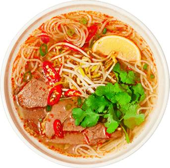 A bold and spicy Vietnamese noodle soup with sliced beef, lemongrass-infused broth, thick rice noodles, and traditional herbs.