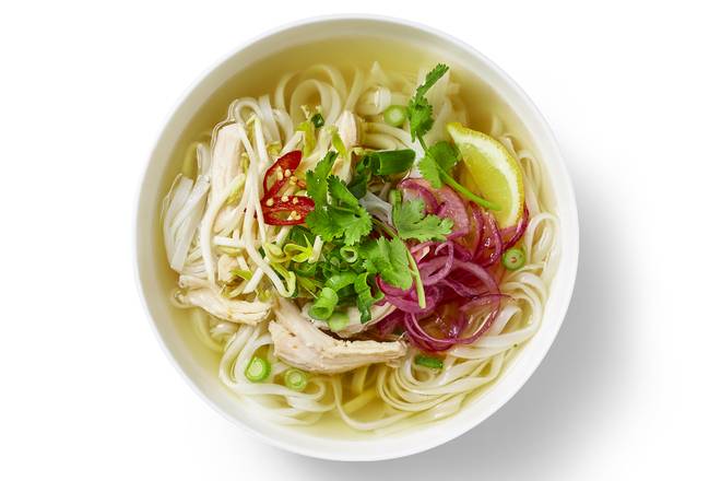 Traditional Vietnamese phở with shredded chicken, flat rice noodles, fragrant herbs, and a slow-cooked aromatic beef broth.