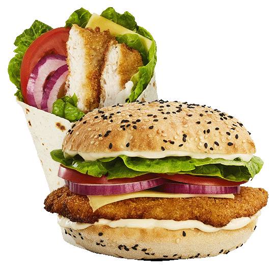 Schnitzel, tasty cheese, baby cos lettuce, tomato, Spanish onion & original mayonnaise.
