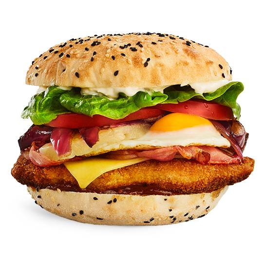 Schnitzel, tasty cheese, rindless bacon, pineapple, egg, baby cos lettuce, tomato, sauteed onions, BBQ relish & aioli. *Eggs subject to availability.